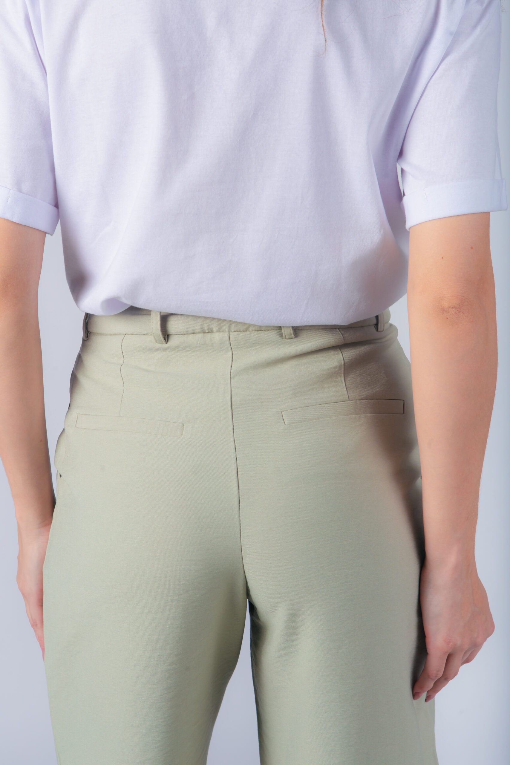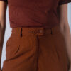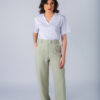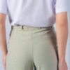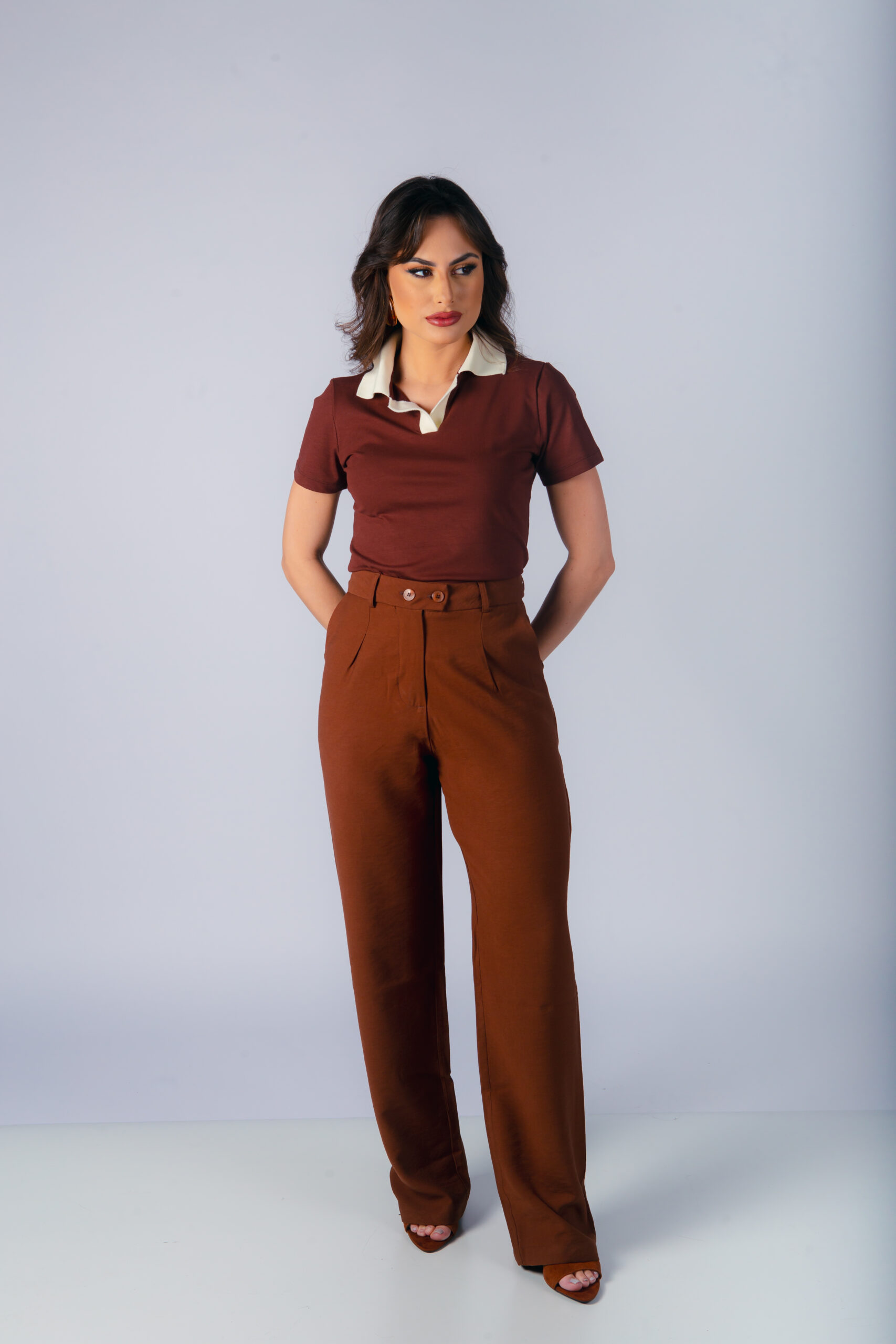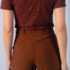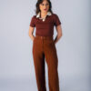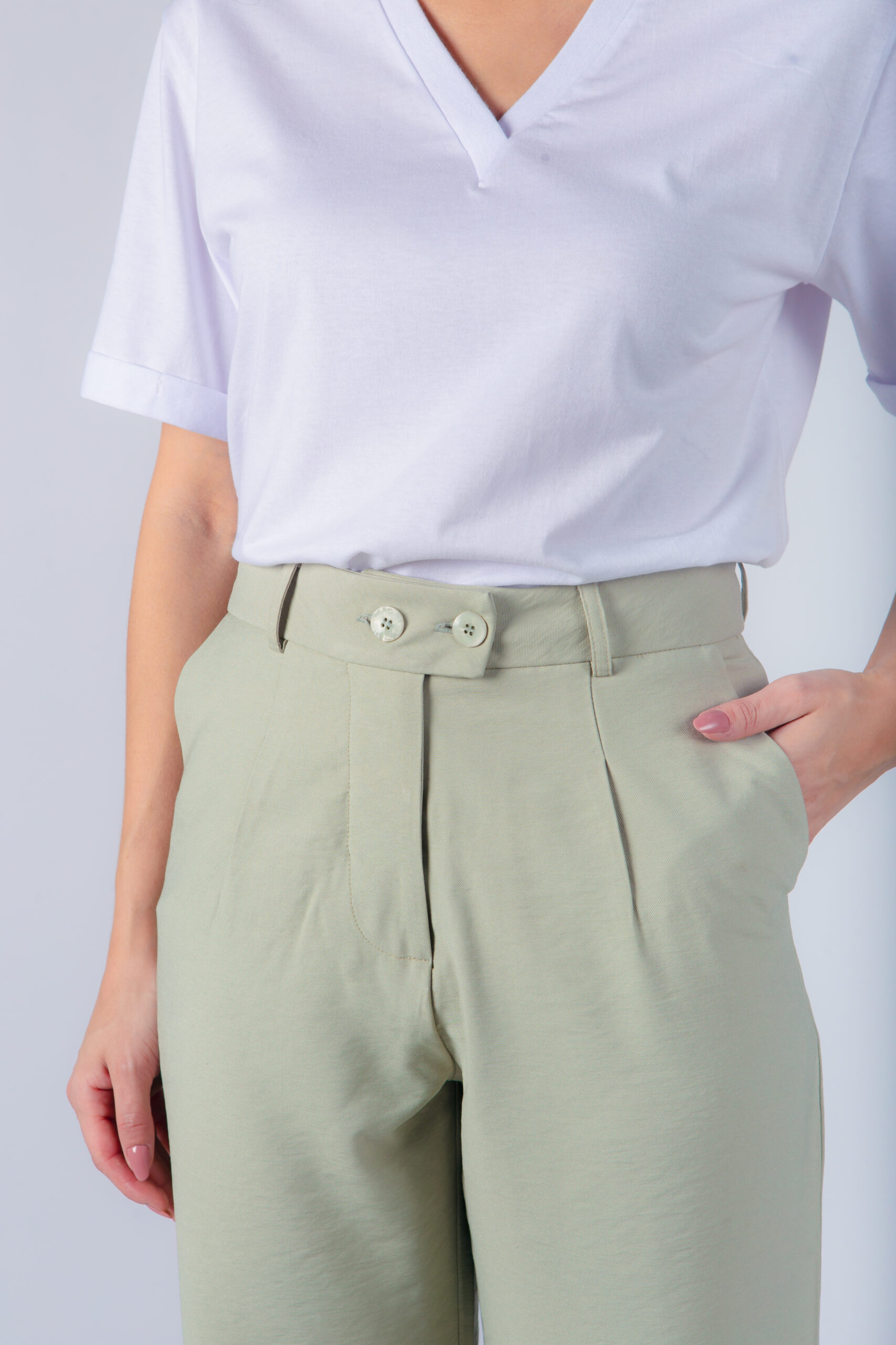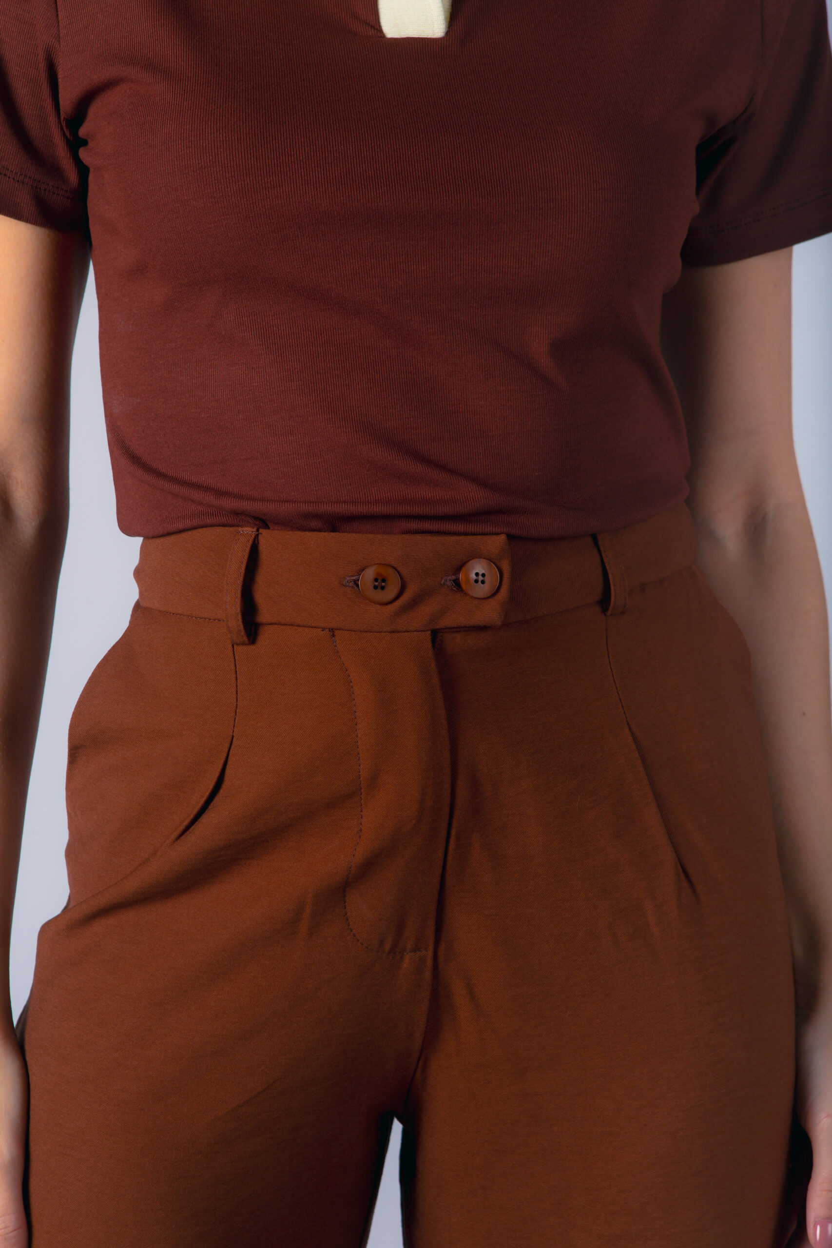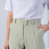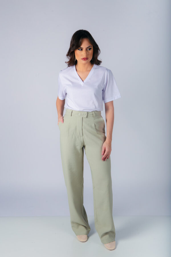 Calça com corte reto, bolso faca e fechamento duplo com botões frontais. Possui passante para cinto.