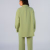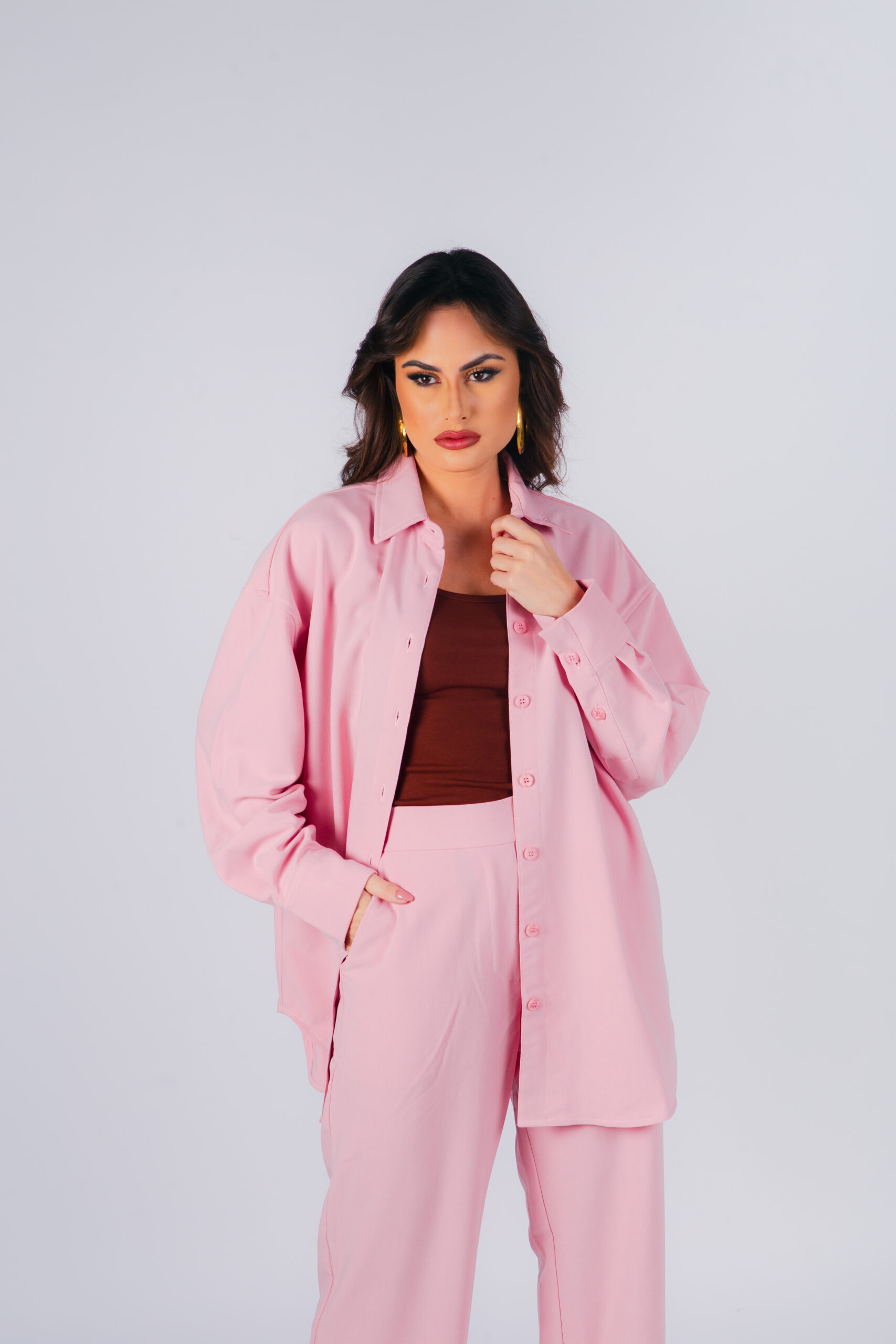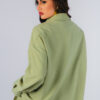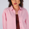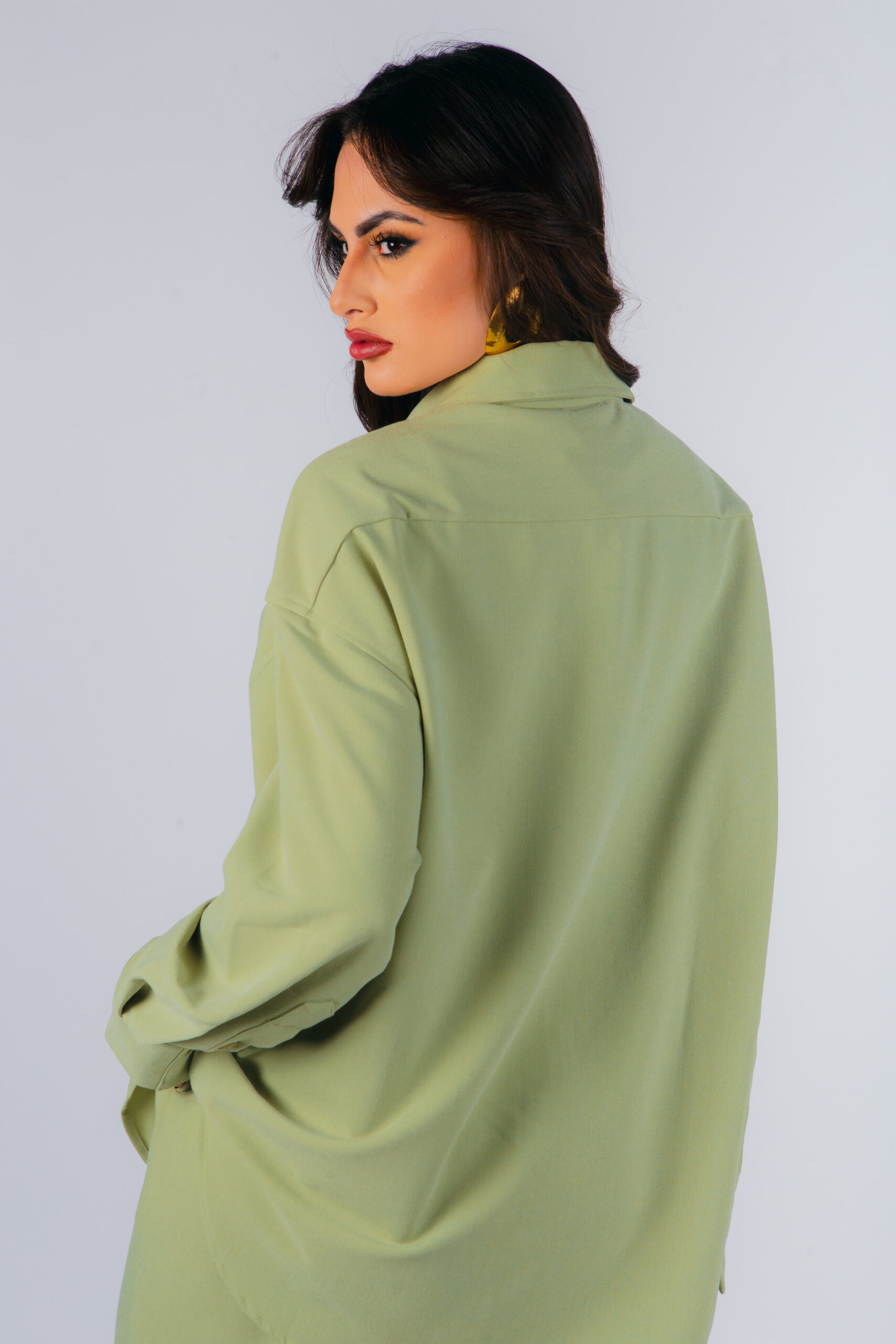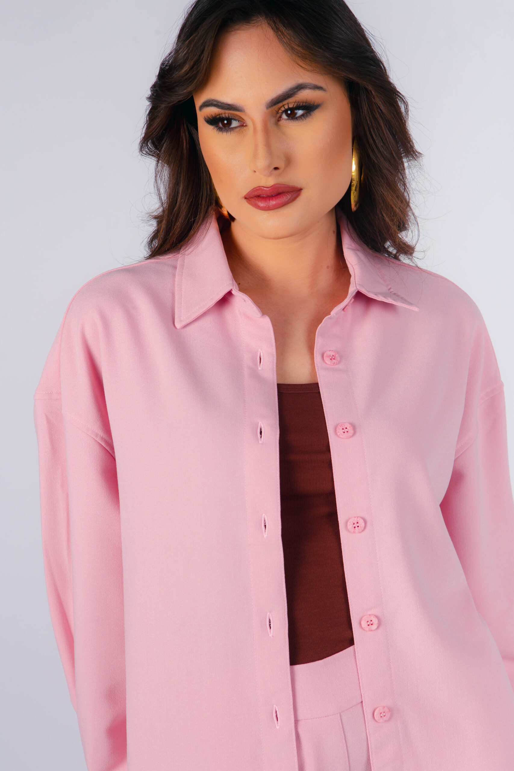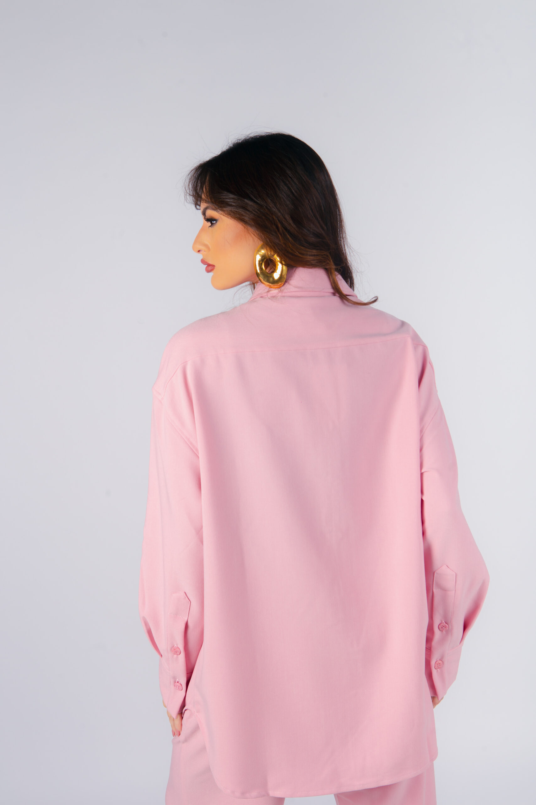 Camisa oversized em crepe, gola com lapela, fecho frontal com botões, bainha assimétrica arredondada, punho italiano.