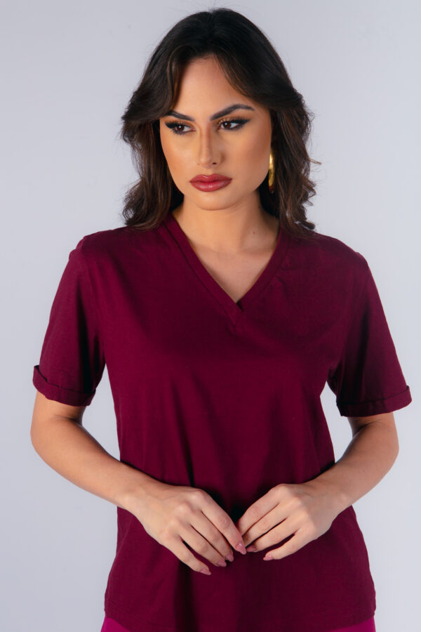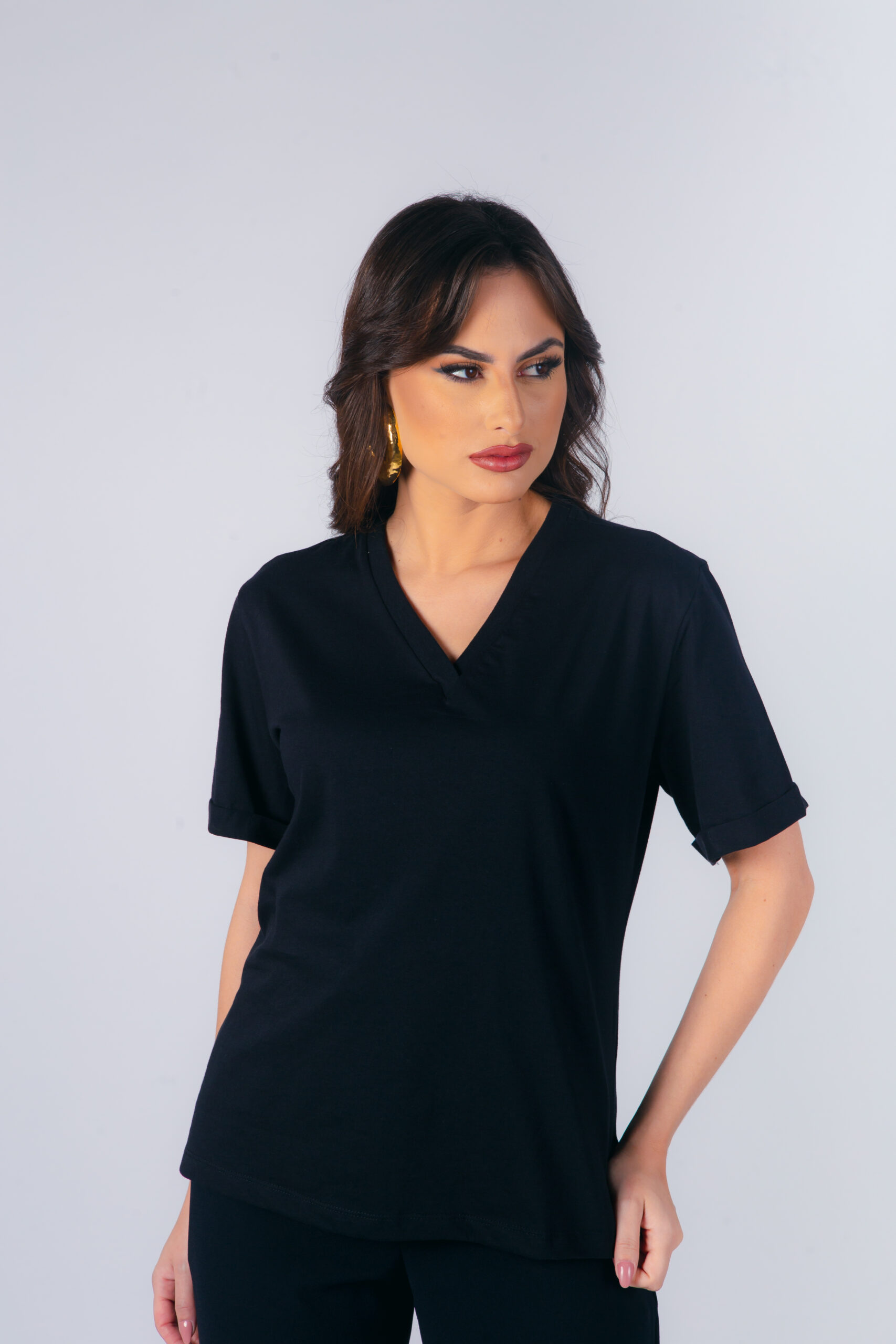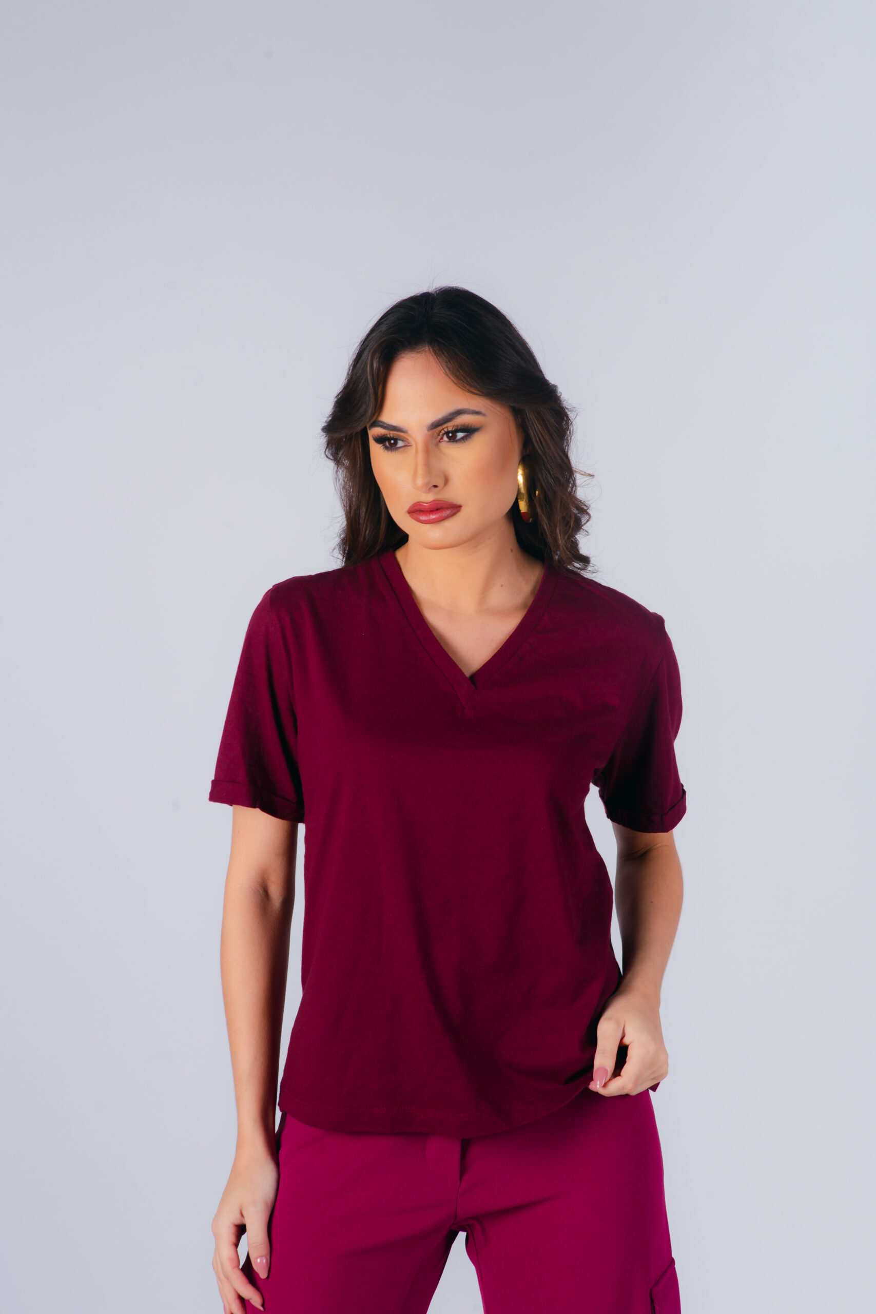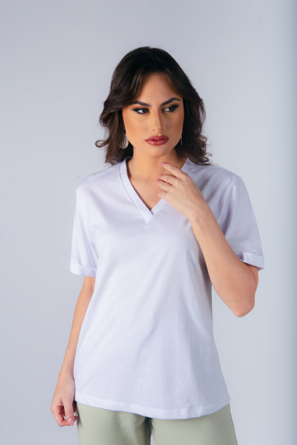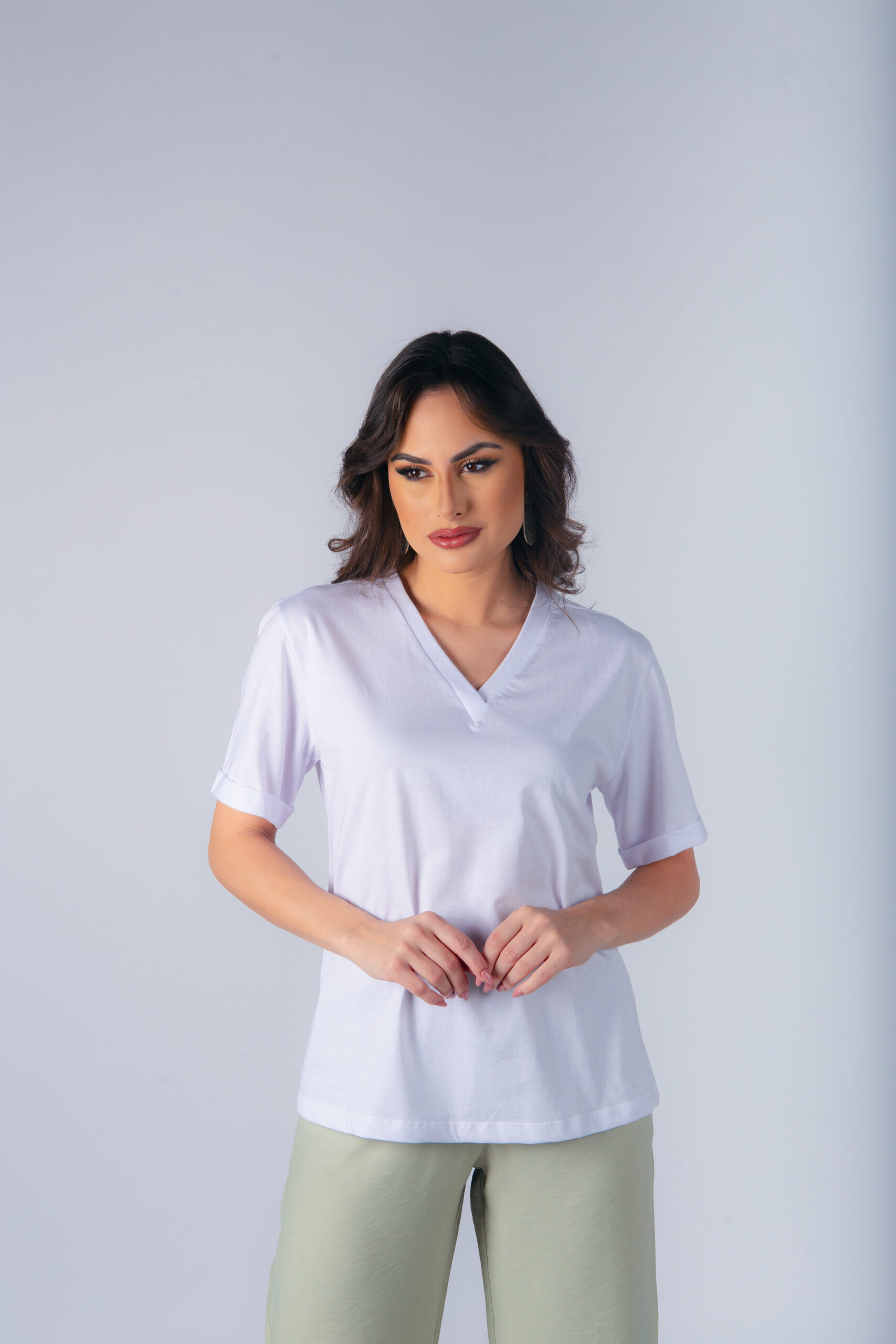 Camiseta em malha com gola em corte “V”, com mangas curtas e dobradas.