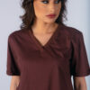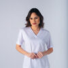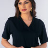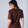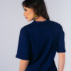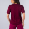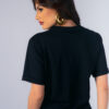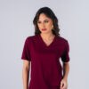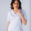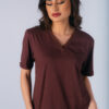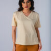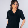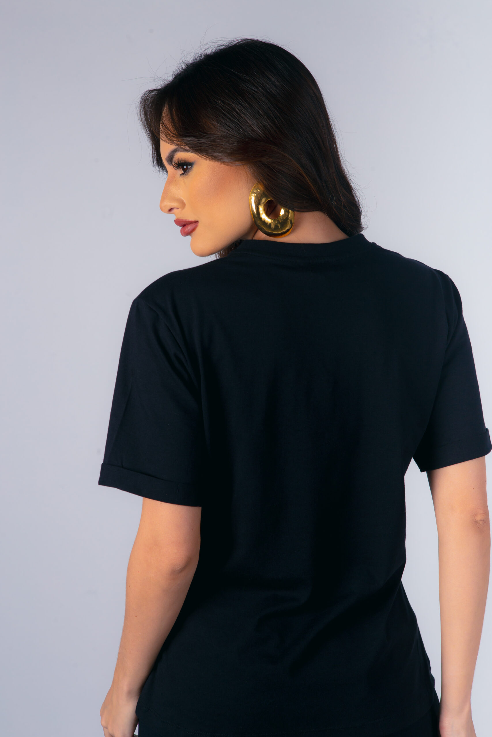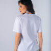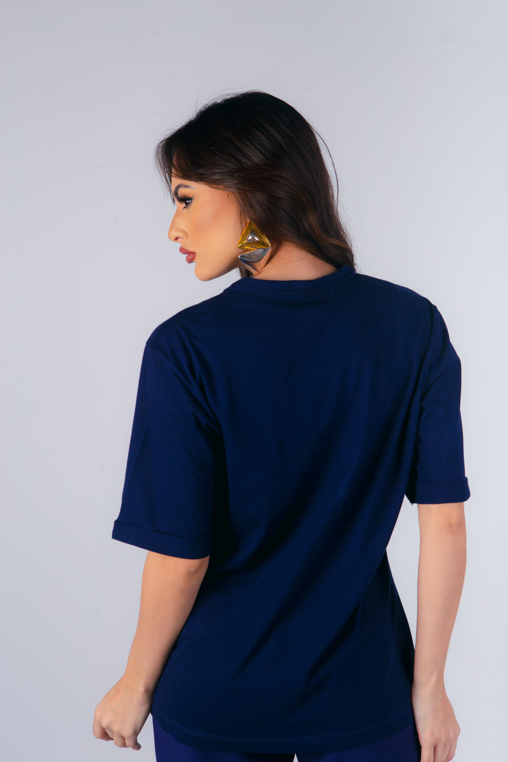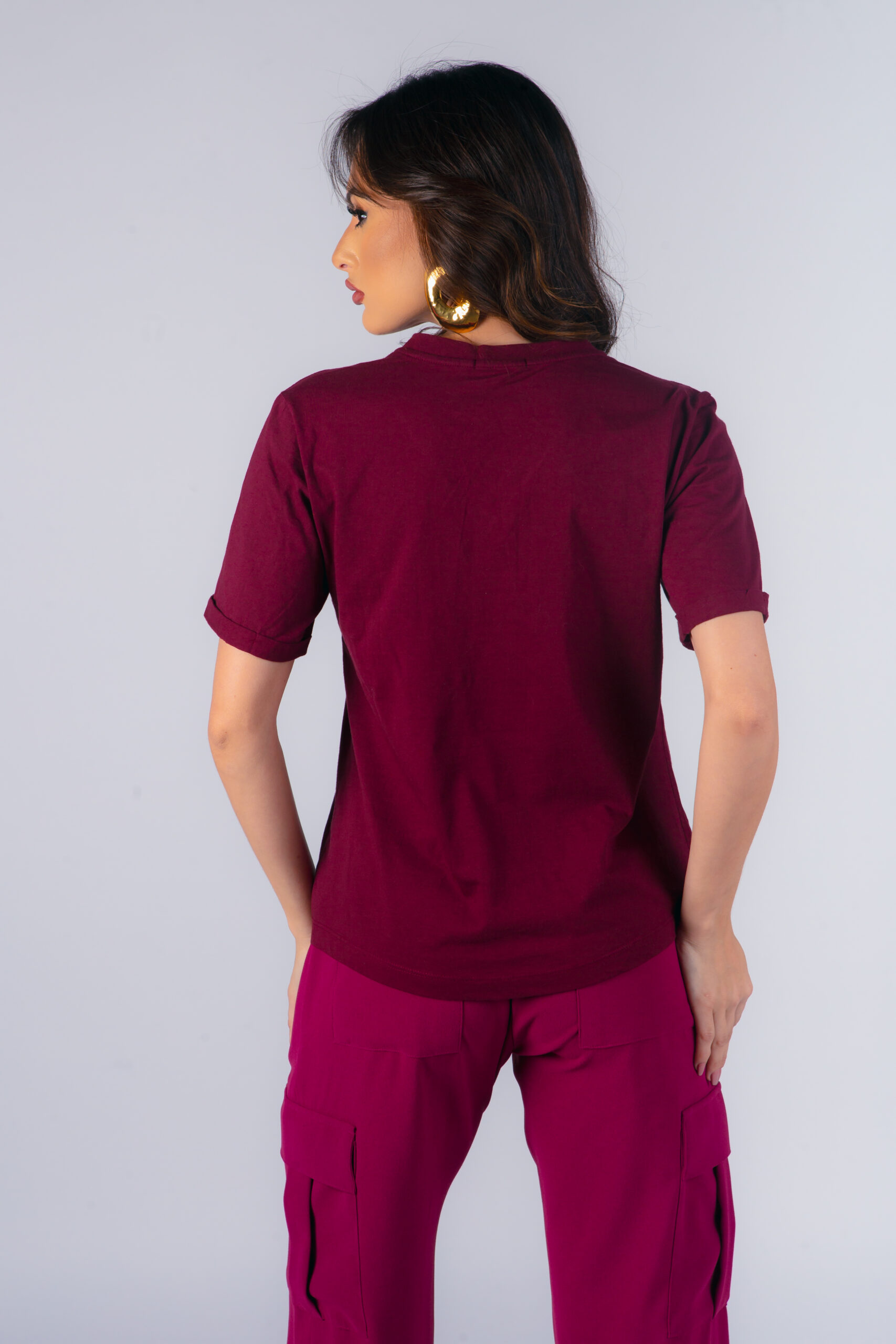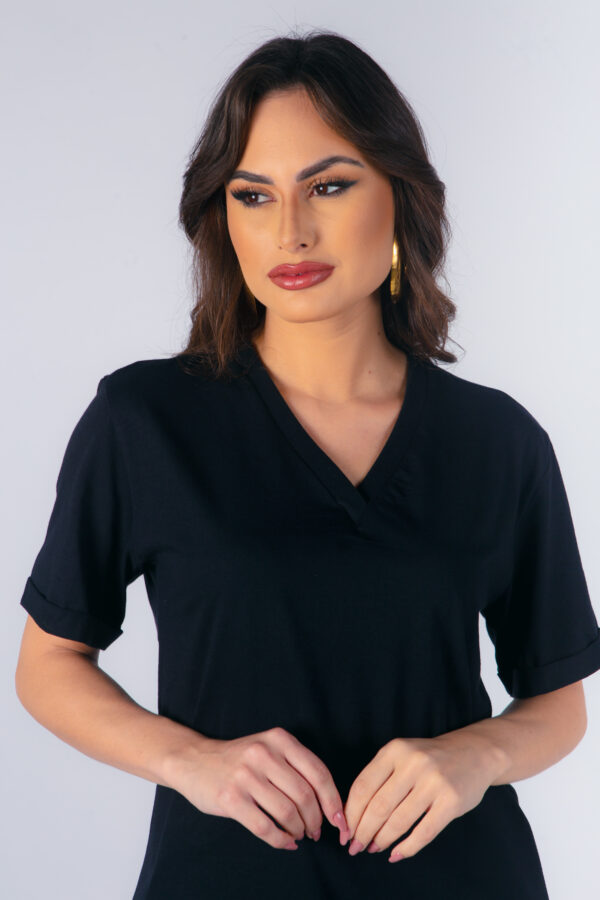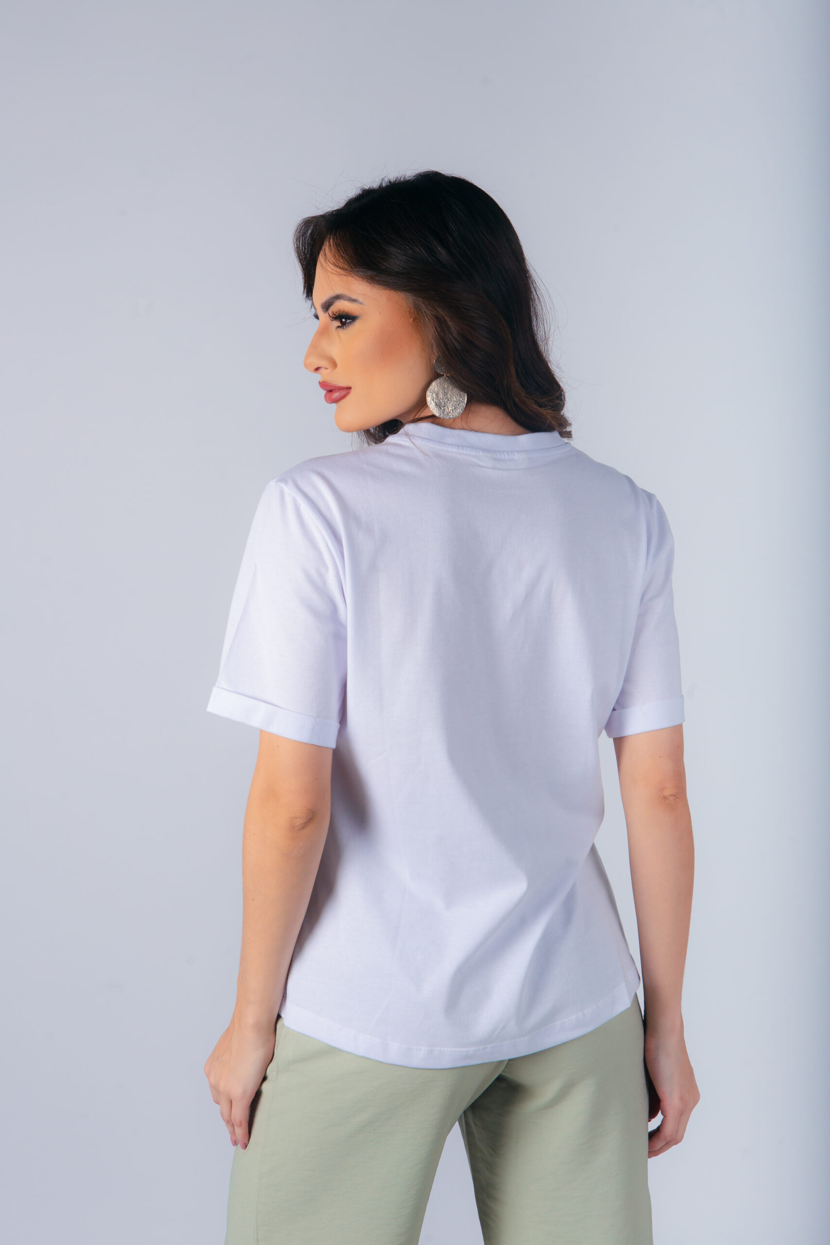 Camiseta em malha com gola em corte “V”, com mangas curtas e dobradas.