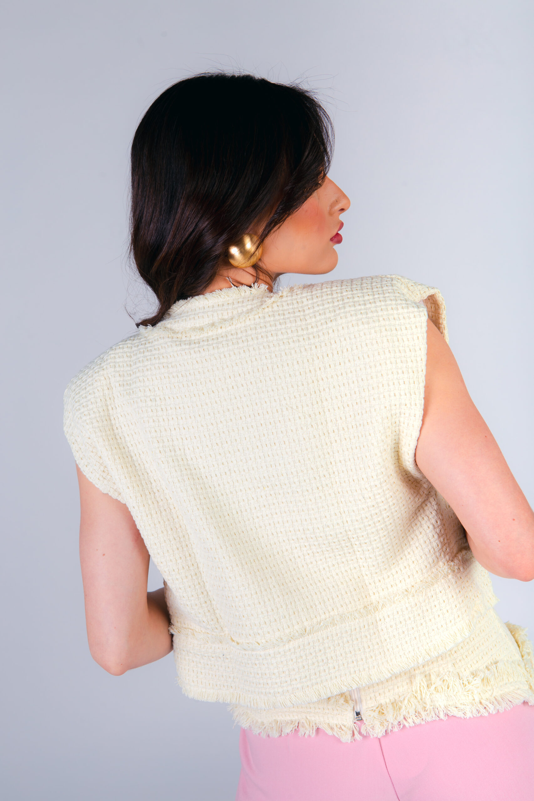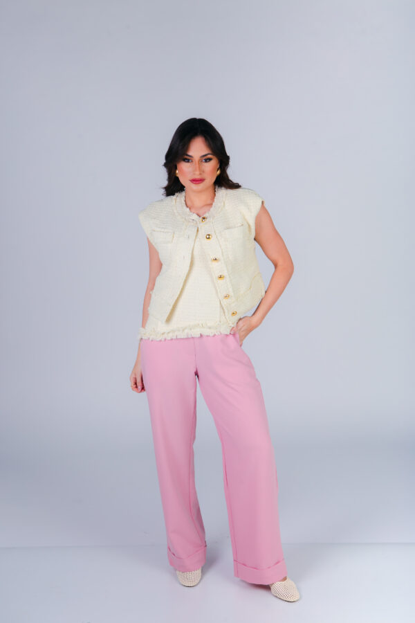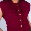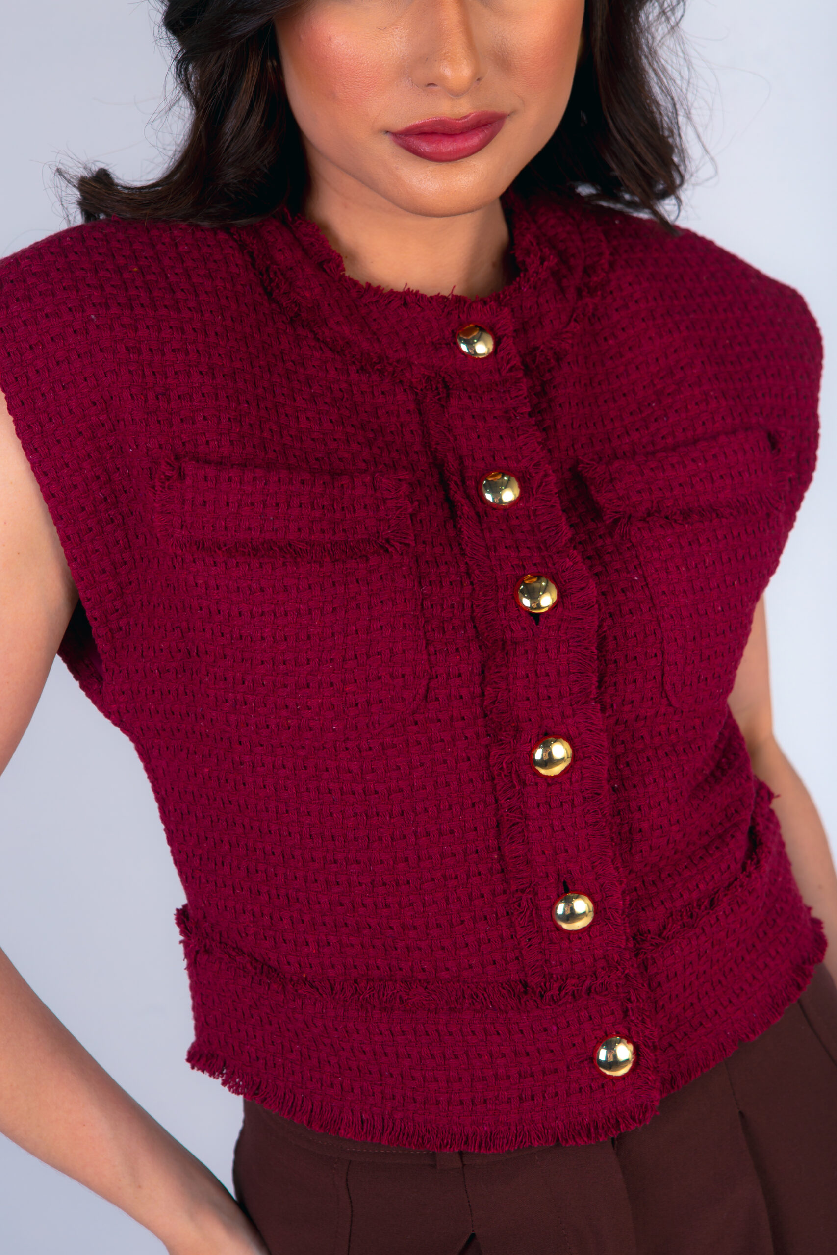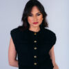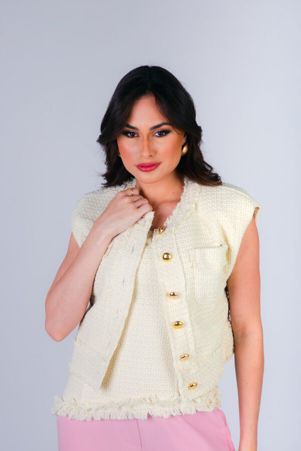 Colete confeccionado em tweed com acabamento desfiado a mão. Possui bolsos frontais e fechamento com botões metálicos dourados.