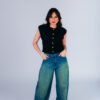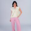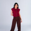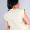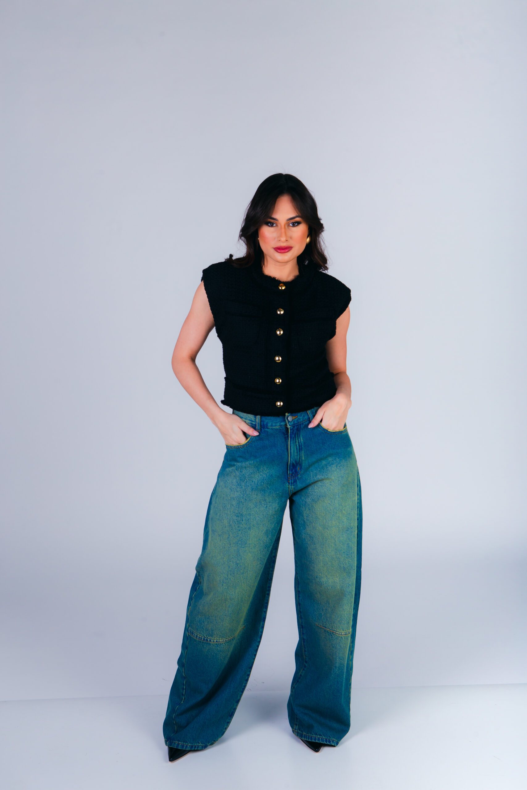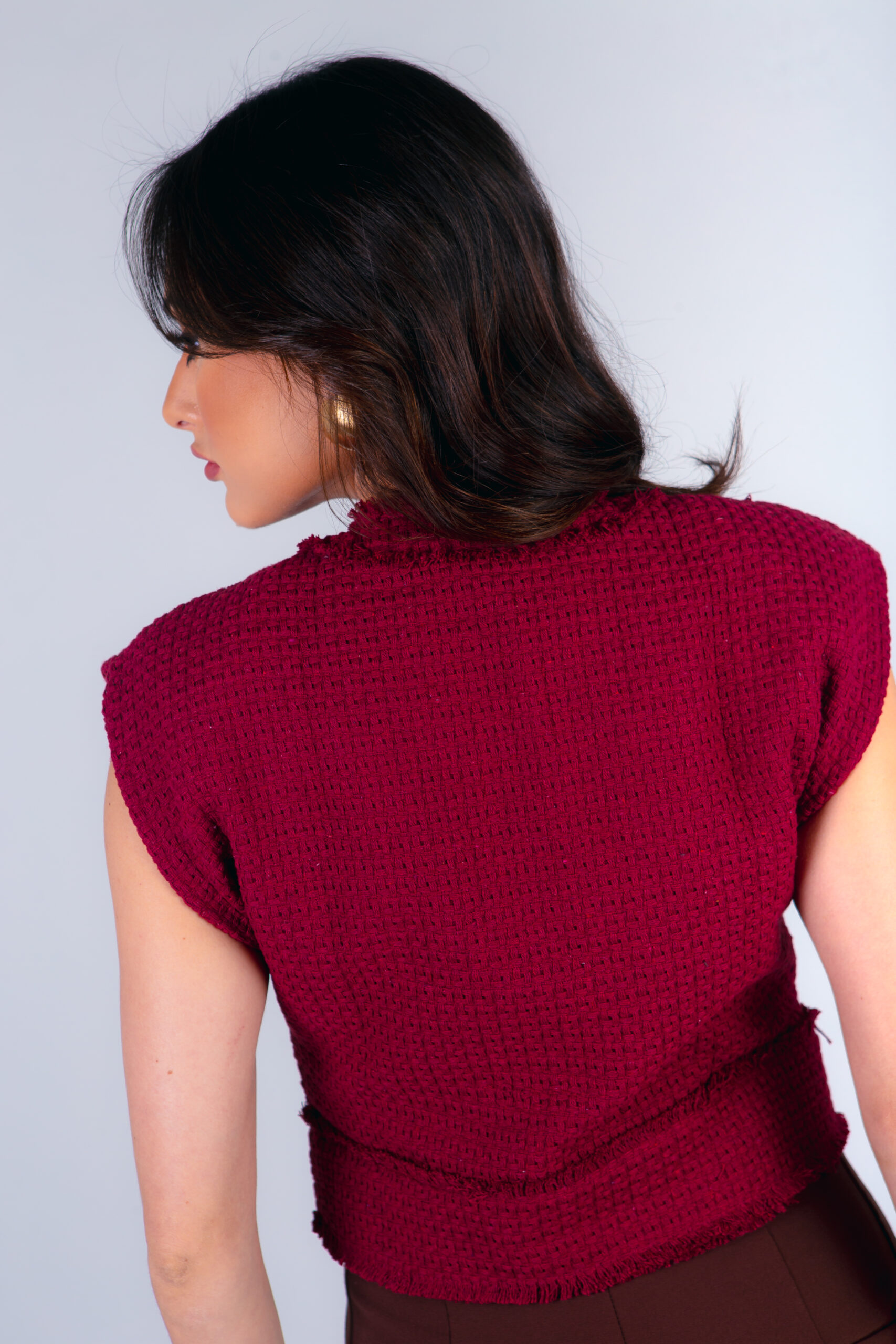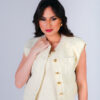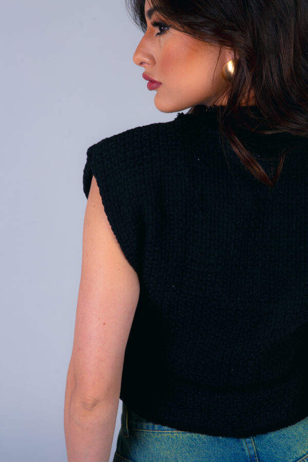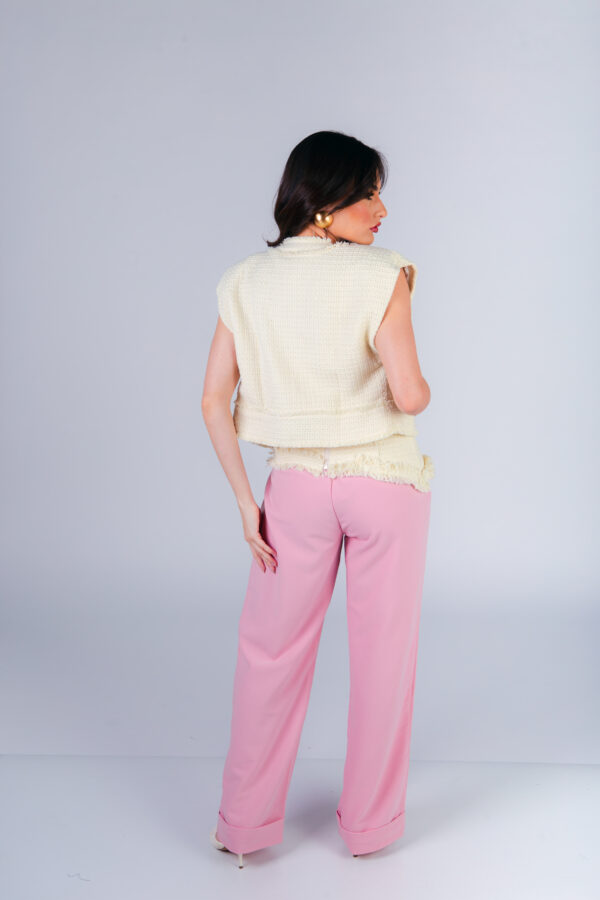 Colete confeccionado em tweed com acabamento desfiado a mão. Possui bolsos frontais e fechamento com botões metálicos dourados.