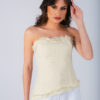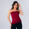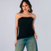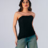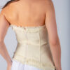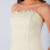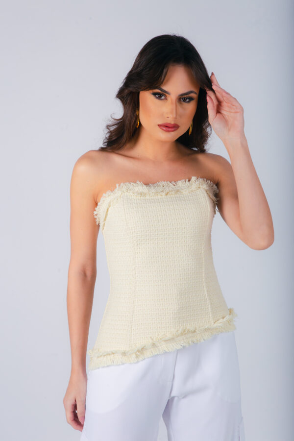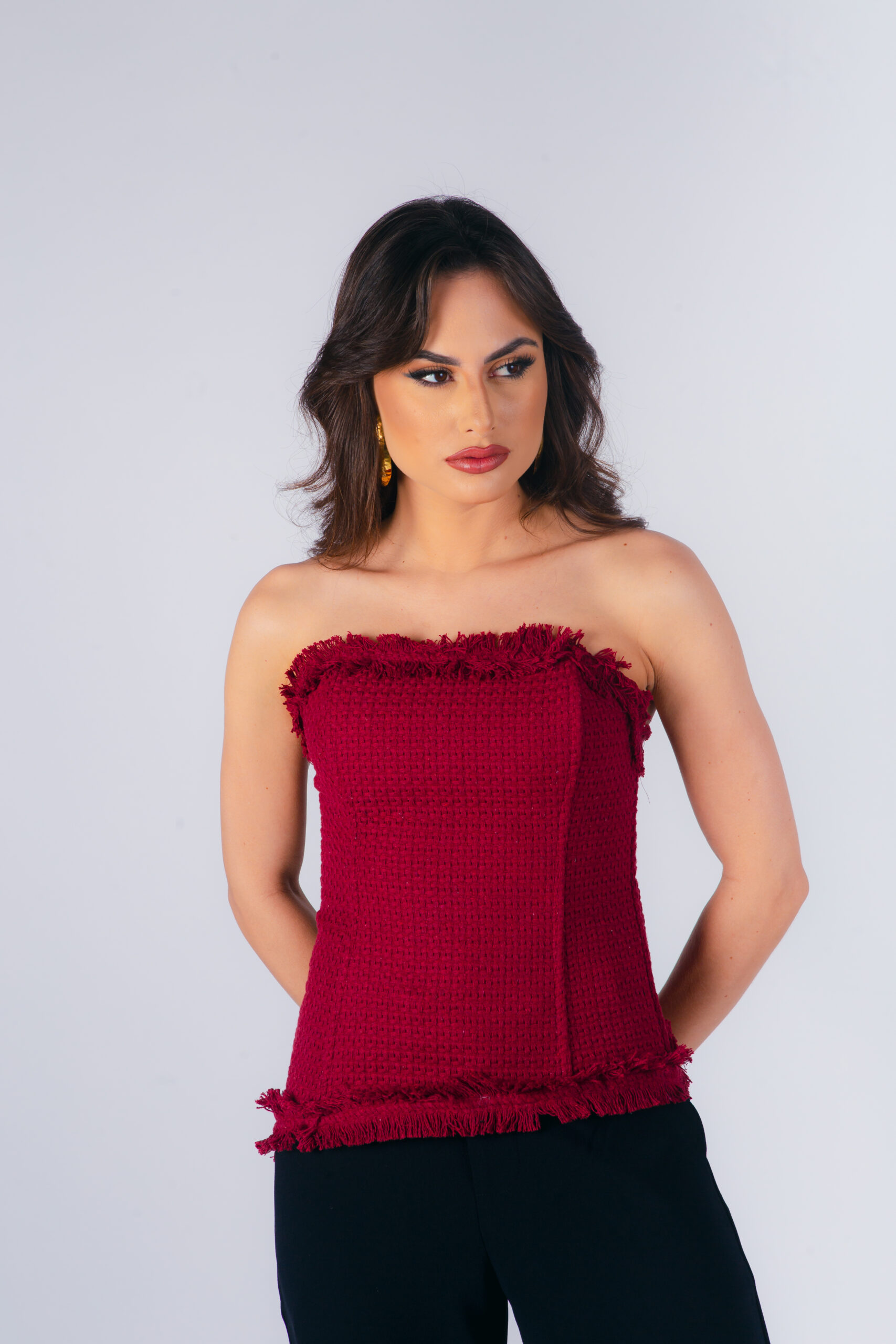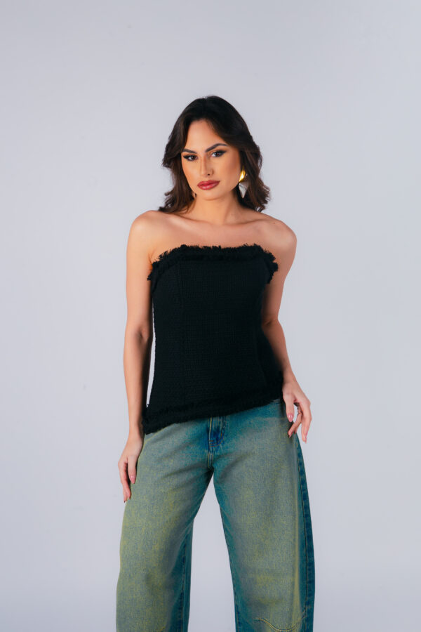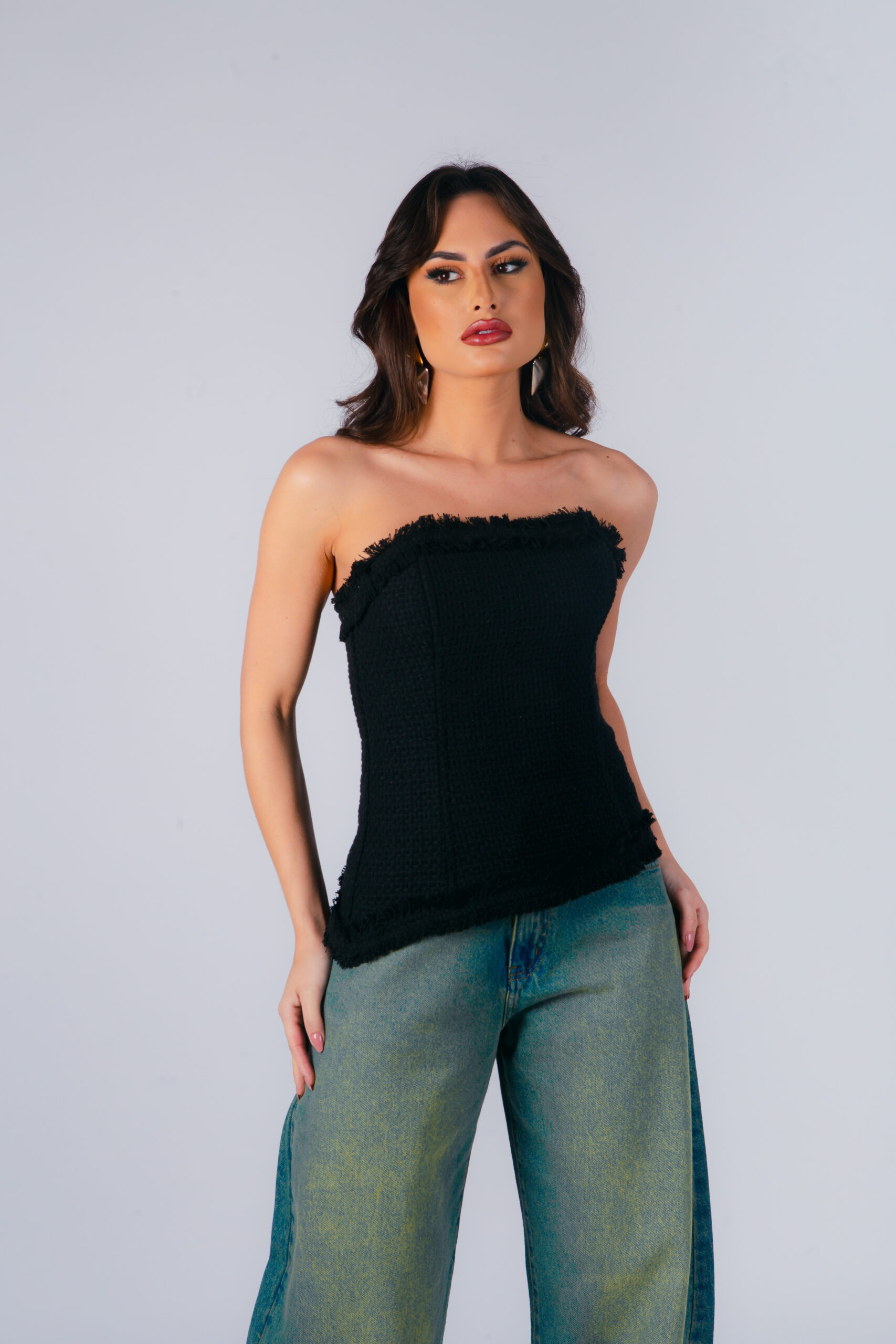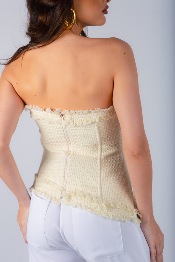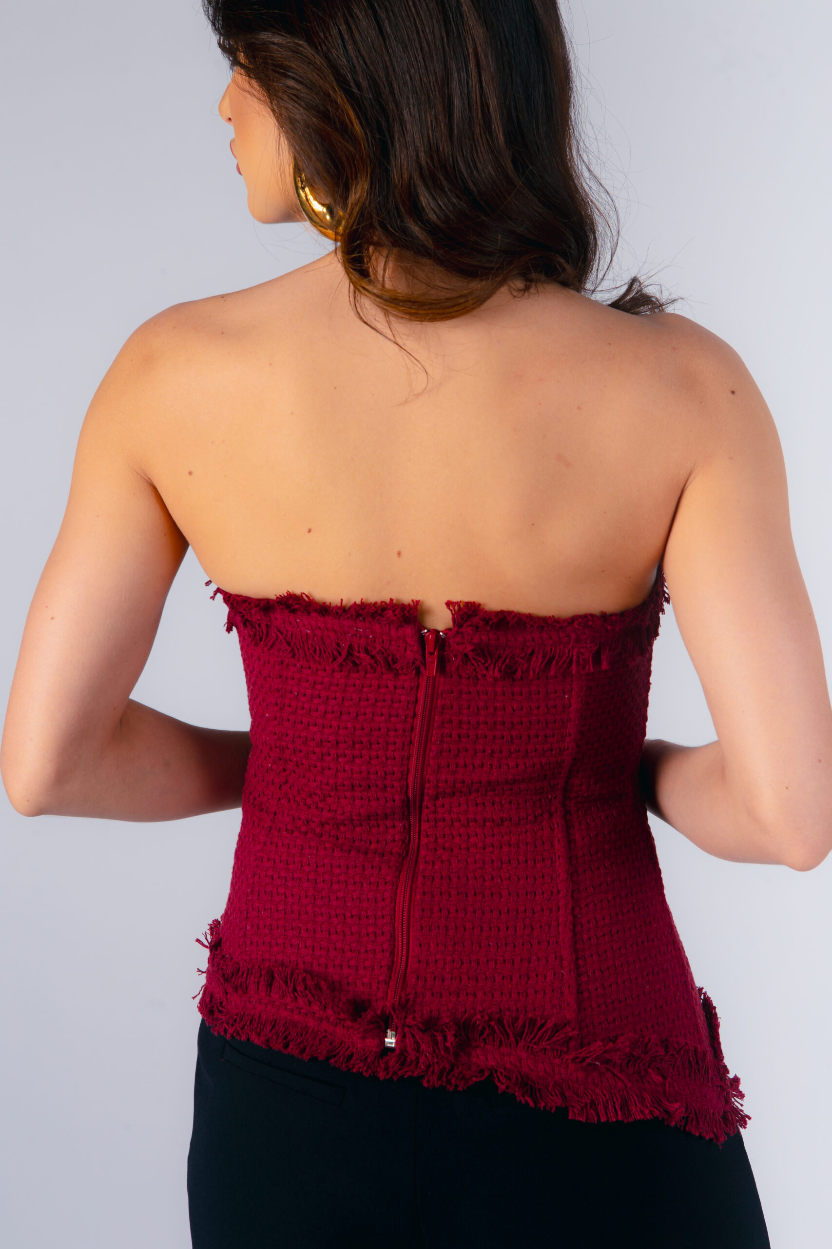 Top sem alças em tweed, com barbatanas que modelam a silhueta e zíper nas costas para um ajuste prático e seguro.