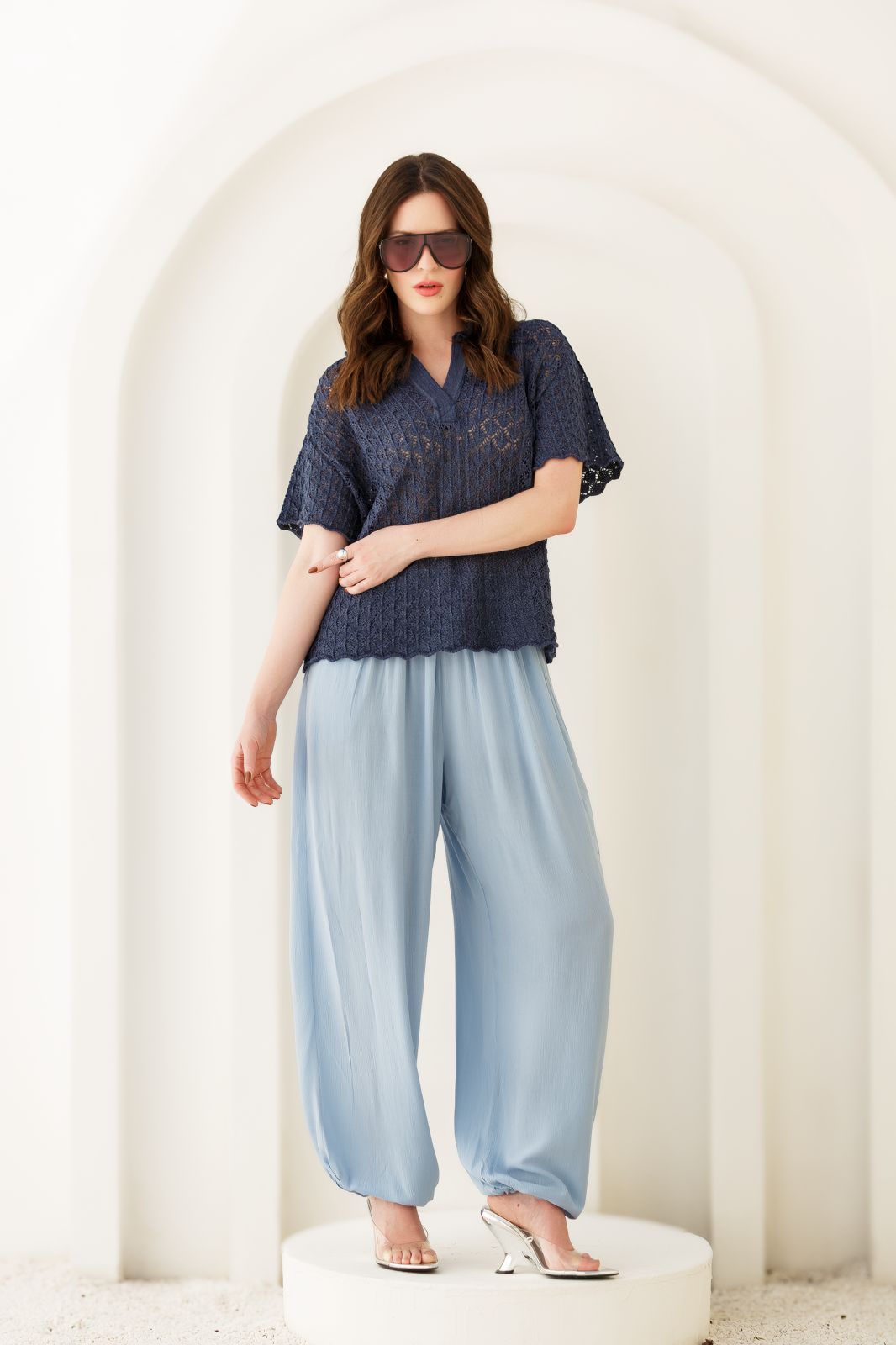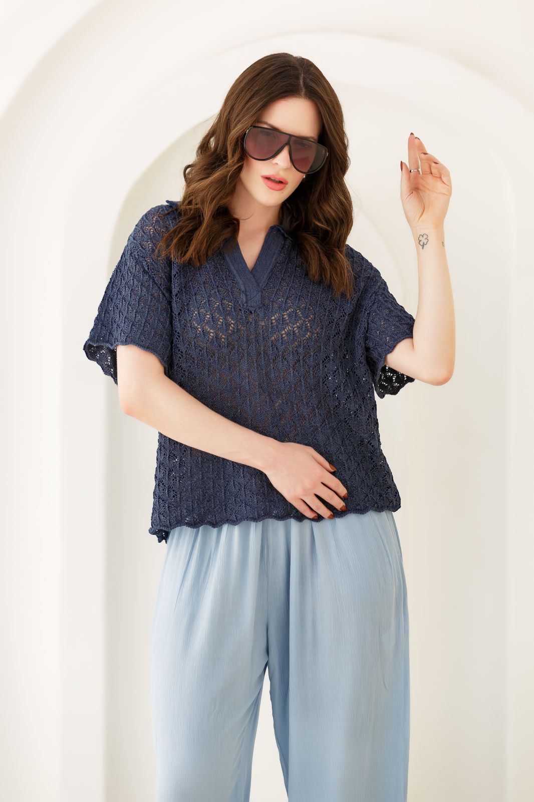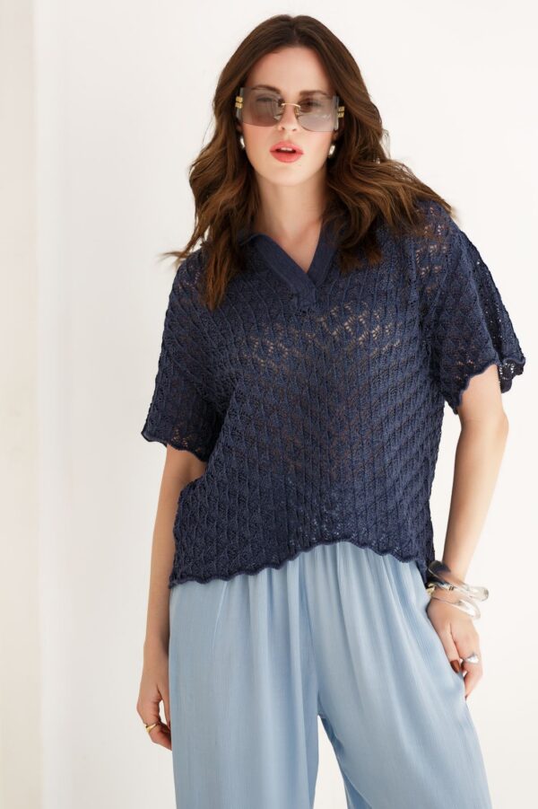 Polo de tricot com trama sofisticada e leve. Modelagem reta com manga curta e ampla, possui decote “V”. Peça ideal para o verão, que une conforto e versatilidade.