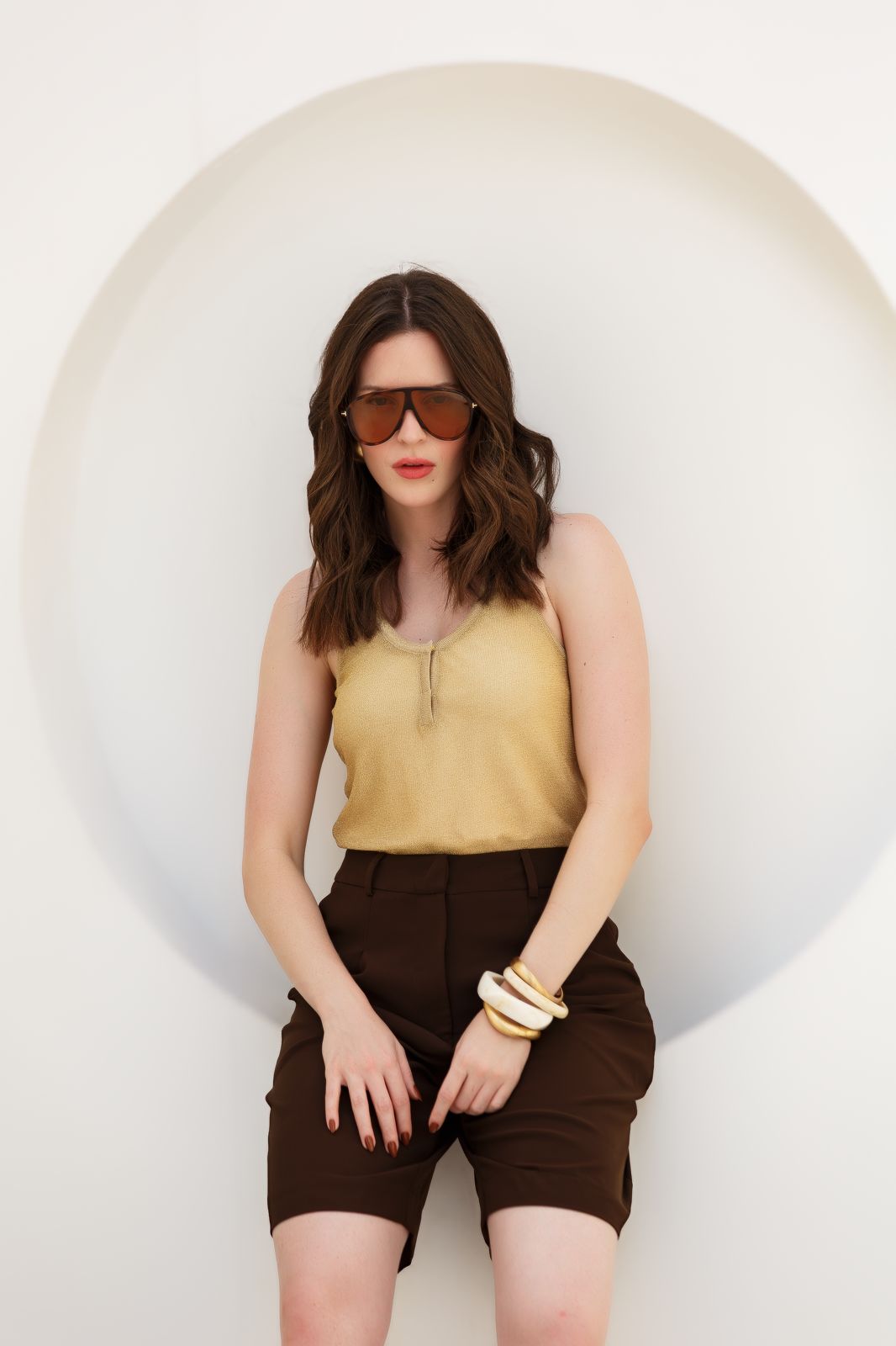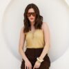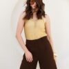 Regata “costas nadador” confeccionada em tricot com textura delicada de lurex, decote V com pequeno fechamento frontal por botões de pressão. Possui leve transparência e acompanha regata confeccionada em poliamida com acabamento em tricot. Excelente escolha para quem busca praticidade e frescor. Peça essencial para composições modernas e elegantes.